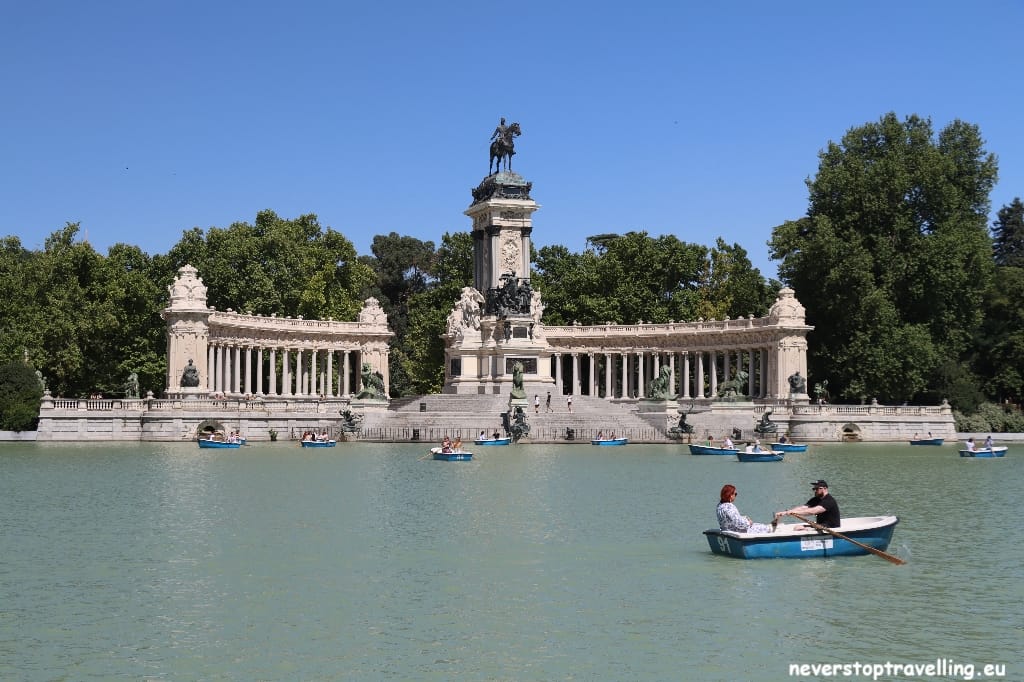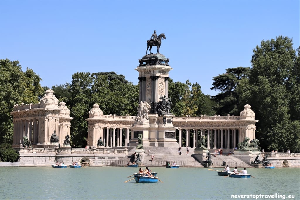 In het park stond ooit het paleis van Filips IV, het Real Sitio del Buen-Retiro-paleis, waarvan nog twee gebouwen resten: het Casón del Buen Retiro en het Museo del Ejército. Tot 1869, toen het park werd opengesteld voor het publiek, was in de 17e eeuw dit het privépark van de koninklijke familie. Centraal in het park ligt een vijver met een zuilengalerij in de vorm van een halve maan met een standbeeld van koning Alfons XII. Je kunt hier roeibootjes huren en heerlijk even een rondje roeien op het meer. Straatmuzikanten, portretschilders en waarzeggers amuseren het publiek. Houd je van een rondje hardlopen, dan snel hier heen. In de vroege ochtend wordt het park overspoeld met hardlopers, de temperaturen zijn dan nog redelijk, dus lopen. Ook doe hier mijn rondje, heerlijk! Dit prachtige park zeker bezoeken tijdens je verblijf in Madrid.