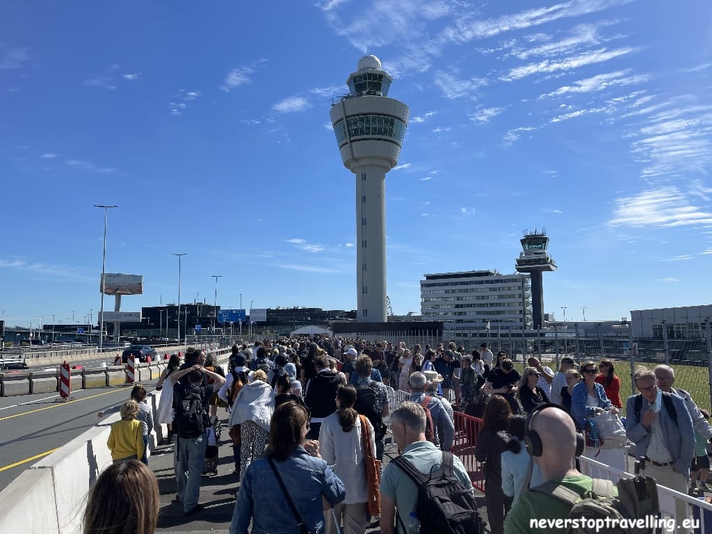 De tocht richting Madrid was iets minder spectaculair te noemen, We kennen allemaal de huidige problemen met tekorten aan personeel op vele luchthavens, waaronder ook Schiphol. Mijn keuze om toch vanuit Schiphol te vliegen was vanwege het concert van Queen in de Ziggo Dome op de avond voor mijn vertrek. Een verkeerde inschatting zeg maar even. Mijn vlucht is om 12.10 uur dus om 07.45 uur op Schiphol aanwezig, helaas m’n bagage check-in nog niet open, dus even geduld maar rond 09.15 uur ben ik toch als een van de eerste mijn koffer kwijt. Op naar de wachtrij voor de security-check, men gaf aan dat het ongeveer 2 uur zou duren, tijd genoeg en geen problemen dus. Uiteindelijk was mijn wachttijd 4,5 uur, dus mijn Iberia vlucht weg.