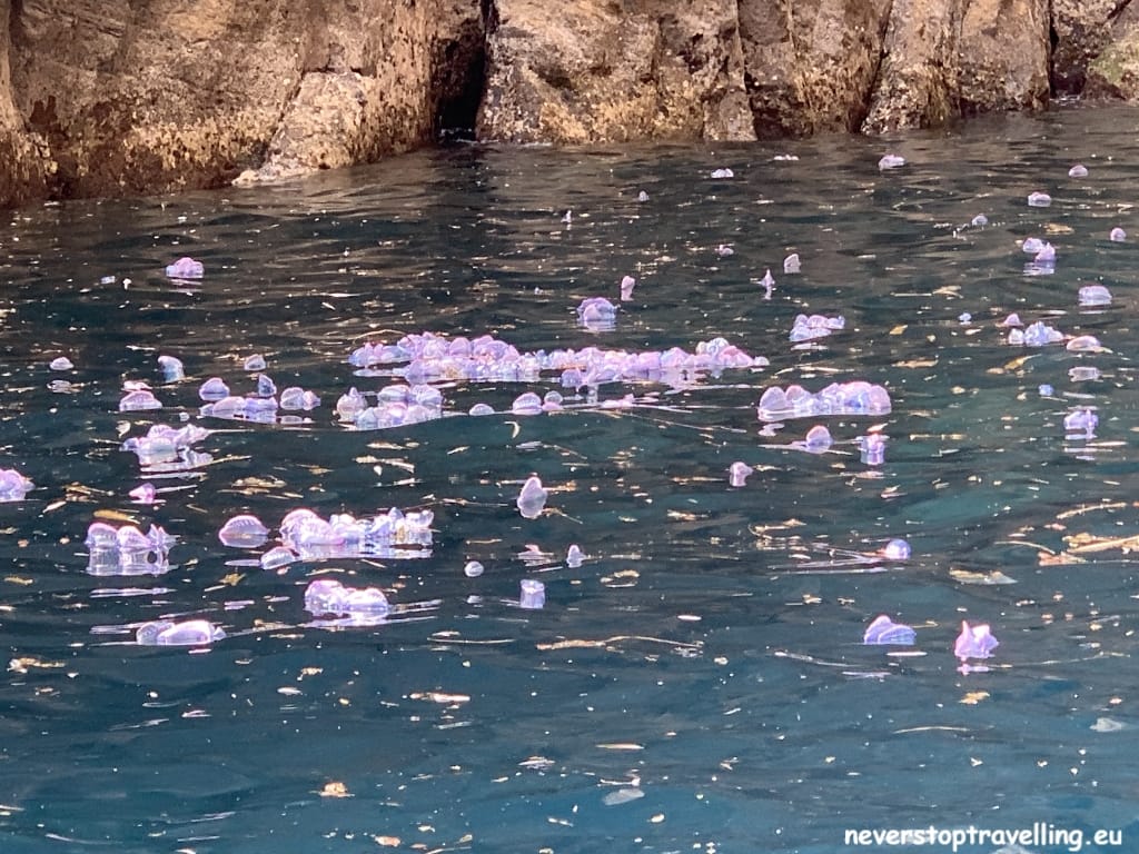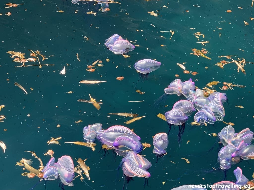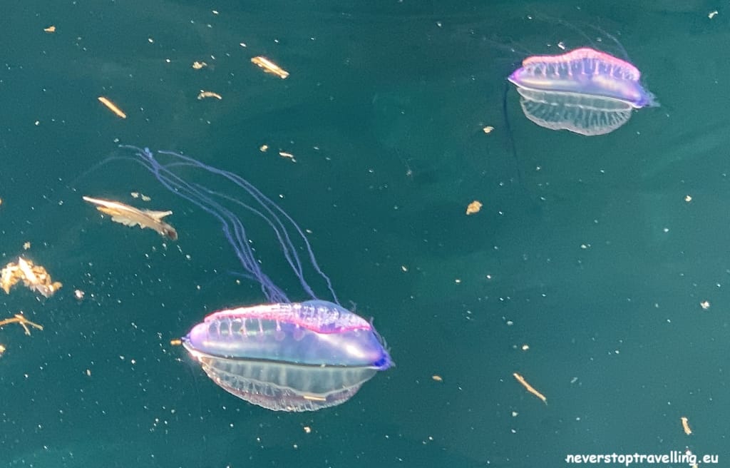 Ze noemen de blauwe kwallen, die er mooi uitzien: Portuguese oorlogsschip omdat ze zo gevaarlijk zijn bij een beet van één kwal heb je al behoorlijke pijn en bij beten van 20 kwallen ben je dood. ze hebben hele lange tentakels; van meters lang en het laatste deel onzichtbaar.