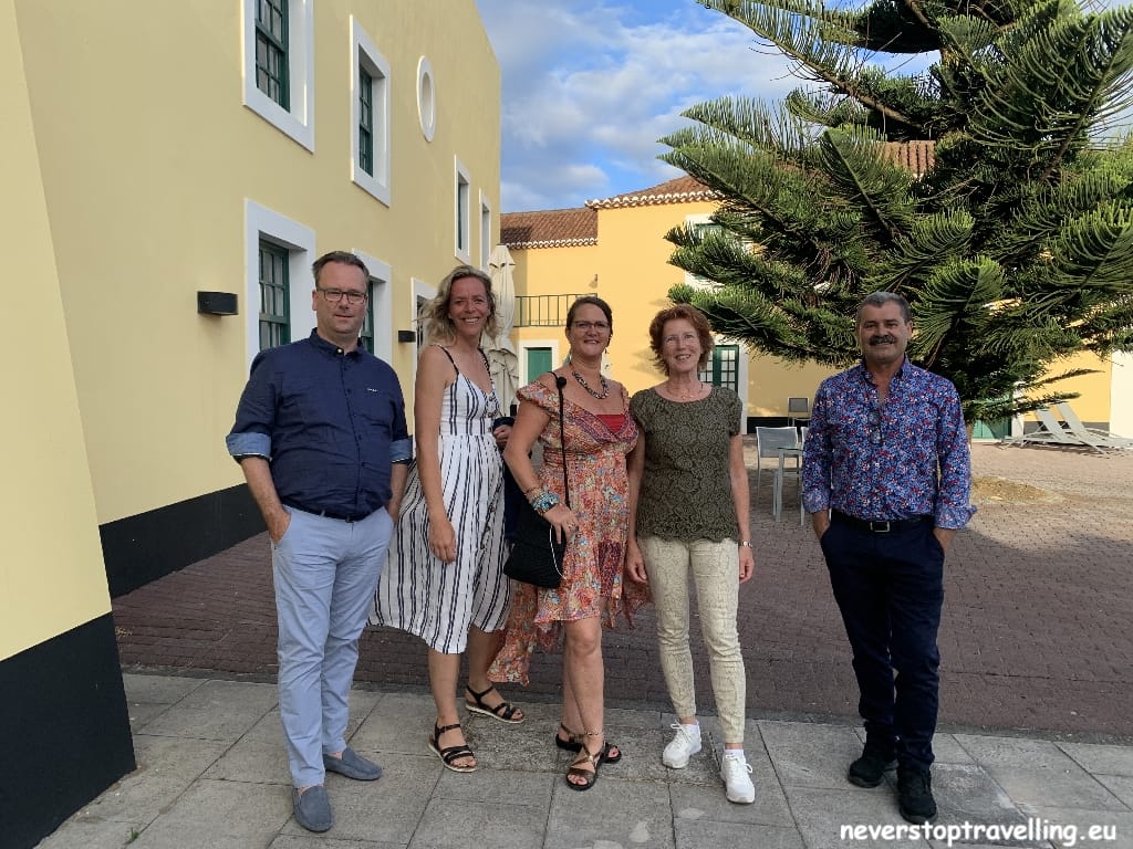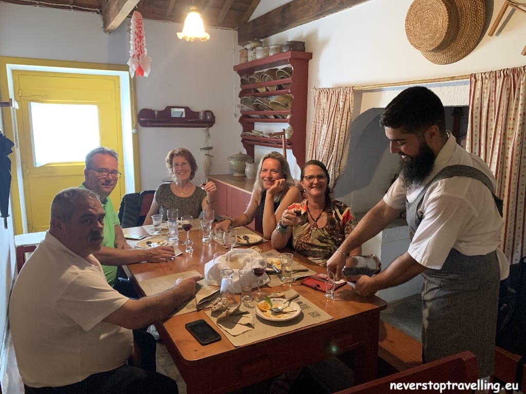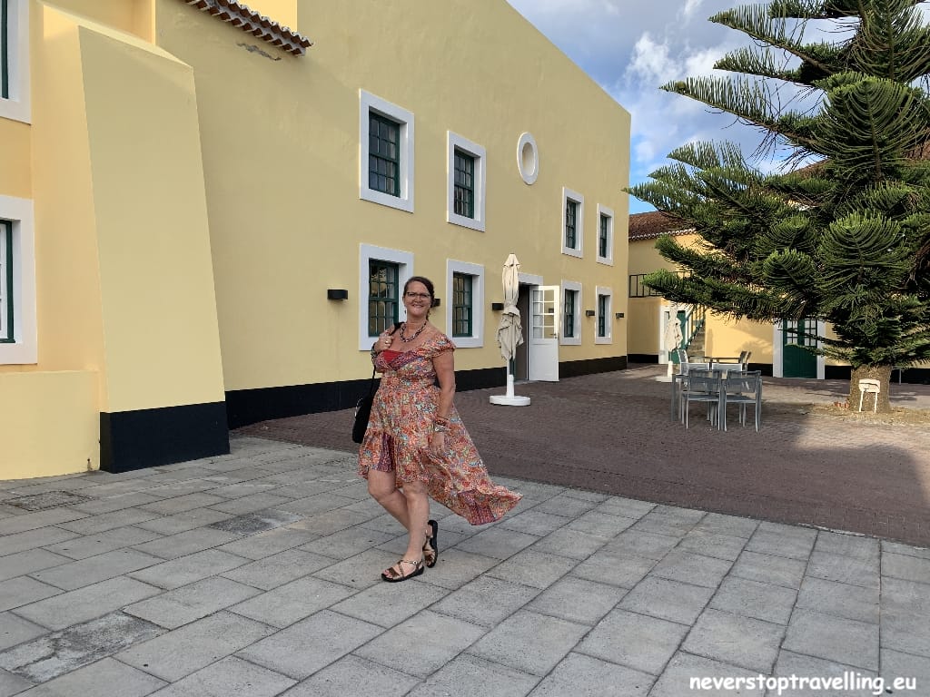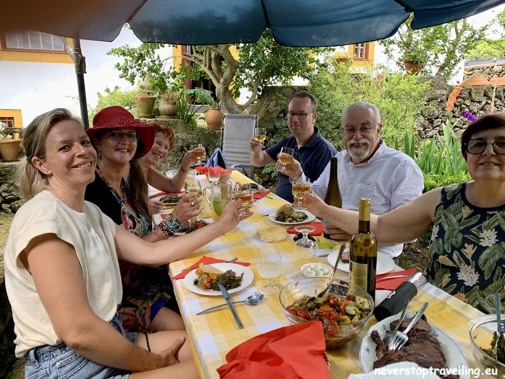 B&B: Quinta do Espírito Santo. Een bijzondere overnachtingslocatie, terug in de tijd, echt bij locals, die je heel graag veel vertellen over historie, rustig kunt wandelen in de grote tuin en ontbijt met de eigenaars, die het ontbijt en op verzoek je lunch en diner bereiden met verse ingredienten uit hun tuin en er een ruime traditionele maaltijd van maken. Aanrader als je van locale contacten houdt en meer over de historie van het eiland te weten wil komen. Wijn, druiven en landschap daar verteldt de eigenaar, de heer Francisco dos Reis Maduro-Dias, graag heel veel over. Hij is Museoloog; Beheer en behoud van cultureel erfgoed. Heeft museologie gestudeerd: met name sociale interventie-museologie. Met daarbij geschiedenis en archeologie en toerisme. We krijgen uitgebreide uitleg over een deel van het eiland, wandelen tussen de wijnranken, proeven diverse wijnen en sluiten af bij het wijnmuseum. Wat zeker een bezoekje waard is.