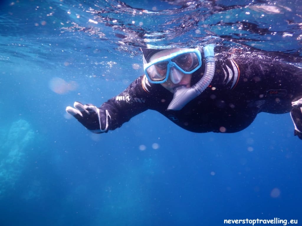 Snorkelen met boottrip: echt een aanrader. Wij gaan met: Octopus diving centrum. We gaan geheel in duikerspakken en handschoenen vanwege het gevaar van de kwallen. Dat is ook de reden dat je niet alleen mag snorkelen of duiken. Het is een mooie klif met vele mooie vissen.