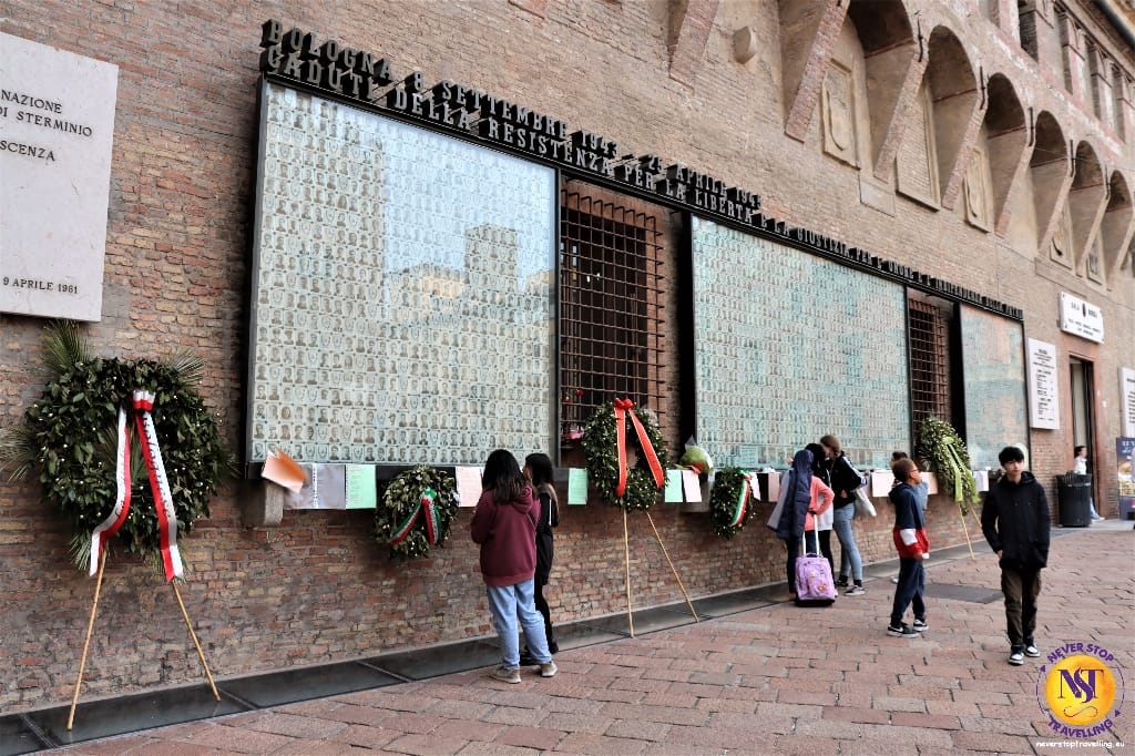 Kijk, vanuit het plein, iets naar het noordwesten naar de oostelijke muur van het Palazzo d’Accursio om een gedenkteken te zien voor de gevallen partizanen van de verzetsbeweging van Bologna uit de Tweede Wereldoorlog. De herdenking begon kort na de bevrijding, zoals bovenaan aangegeven. Familieleden van partizanen die op het plein werden gedood – partizanen werden allebei op het plein opgehangen en tegen deze muur geschoten – begonnen foto’s van de doden op te hangen, waarbij ze bloemen en begrafenisoffers achterlieten. Wat begon als een geïmproviseerd gedenkteken voor de mensen die op deze plek zijn omgekomen, werd vervolgens uitgebreid met de meer dan 2.000 mannen en vrouwen uit Bologna die in de verzetsbeweging werden gedood. Hun beelden, beschermd achter glas, staren nog steeds naar voorbijgangers.