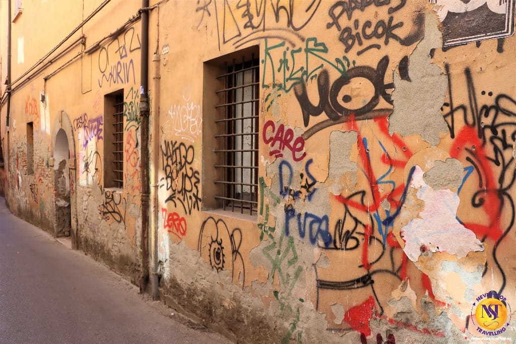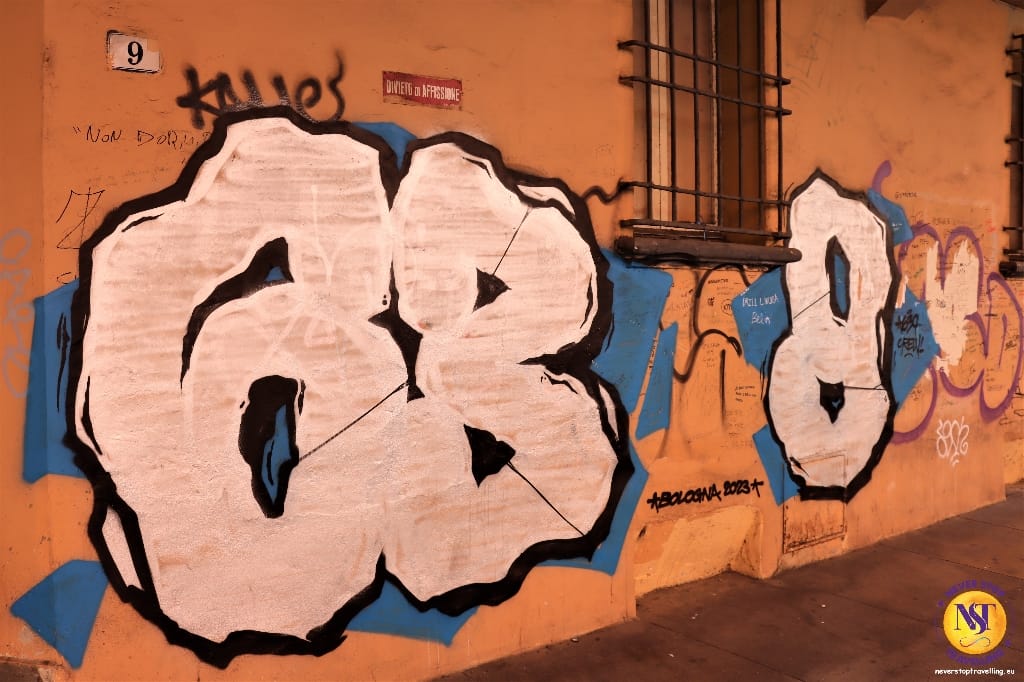 Als je door de schitterende, soms wat vervallen uitziende, steegjes van Bologna wandelt, kom je overal muurschilderingen tegen. Ziet er af toe wat rommelig uit maar heeft zeker zijn charme in de straatbeelden.