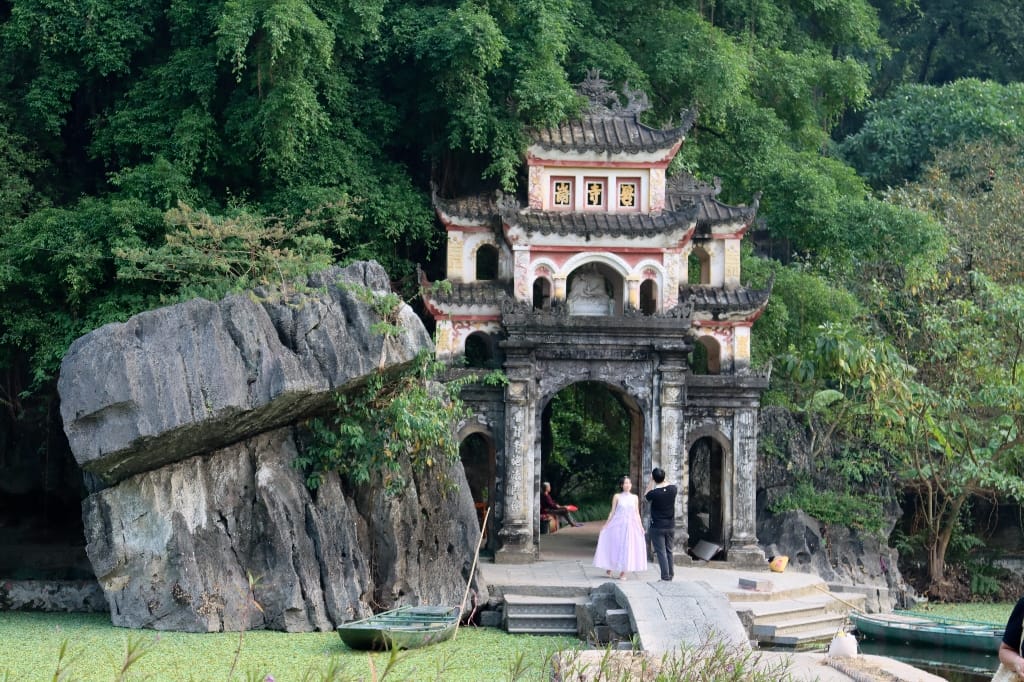 Eenmaal aangekomen in Trang An stappen we in traditionele sampanbootjes. Voor de komende drie uur worden we overgeleverd aan de kundige roeiers, die zowel met hun handen als hun voeten de boot moeiteloos door het water sturen. Omringd door de karstbergen, vaart de boot door stille grotten en langs valleien waar de tijd lijkt stil te staan. De serene sfeer is adembenemend – het voelt alsof we zijn afgedaald in een andere wereld, ver weg van de hectiek van de stad.