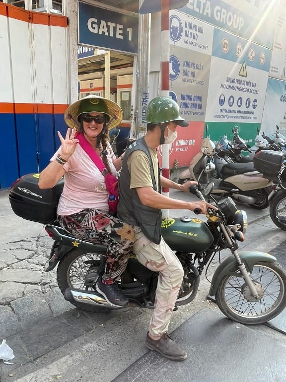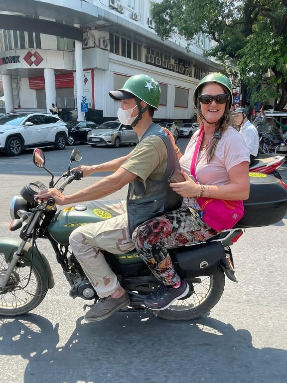 We staan vol spanning klaar voor ons volgende avontuur: de Minsk-motortour! Een korte veiligheidsbriefing later trek ik mijn helm aan en stap achterop. Het wordt meteen duidelijk dat de enige manier om écht door Hanoi te navigeren, is zoals de locals dat doen: zigzaggend door smalle straatjes en meedeinend met de eindeloze stroom van scooters en motoren. De straten zijn een kleurrijke mengelmoes van koloniale gebouwen, tempels en verborgen markten, elk hoekje met een eigen verhaal en sfeer.
