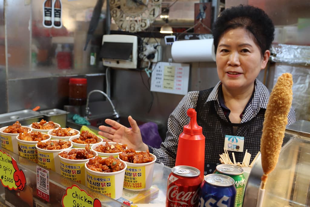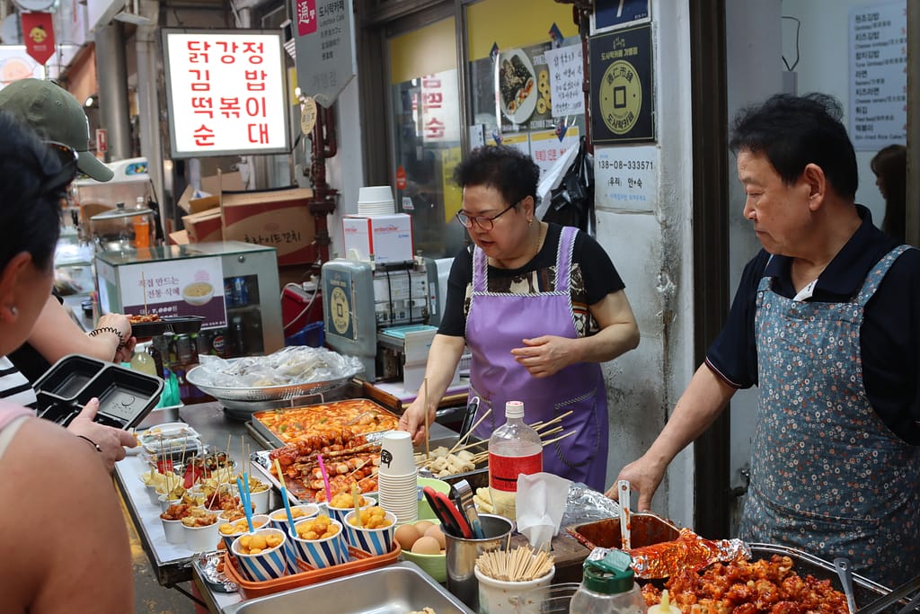 We bezoeken een traditionele markt; Gwengjang Market, bekend om de heerlijke streetfood; waar veel locals hun verse maaltijd scoren. De octopus is erg populair om levend uit te kiezen…. We scoren een zoete soort wafel met warme stroop/honing. Heerlijk.