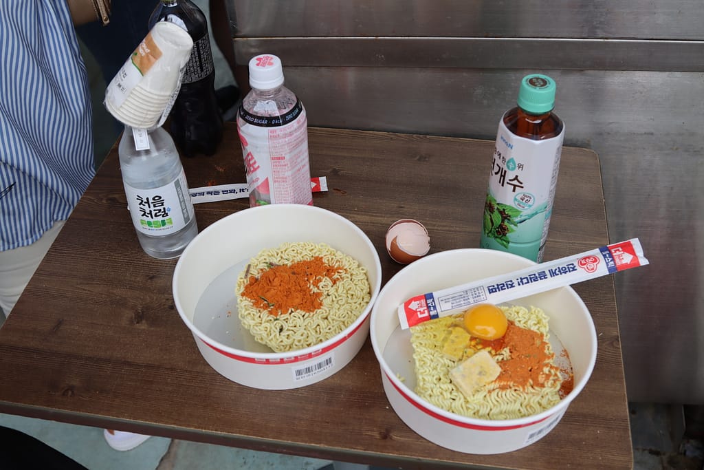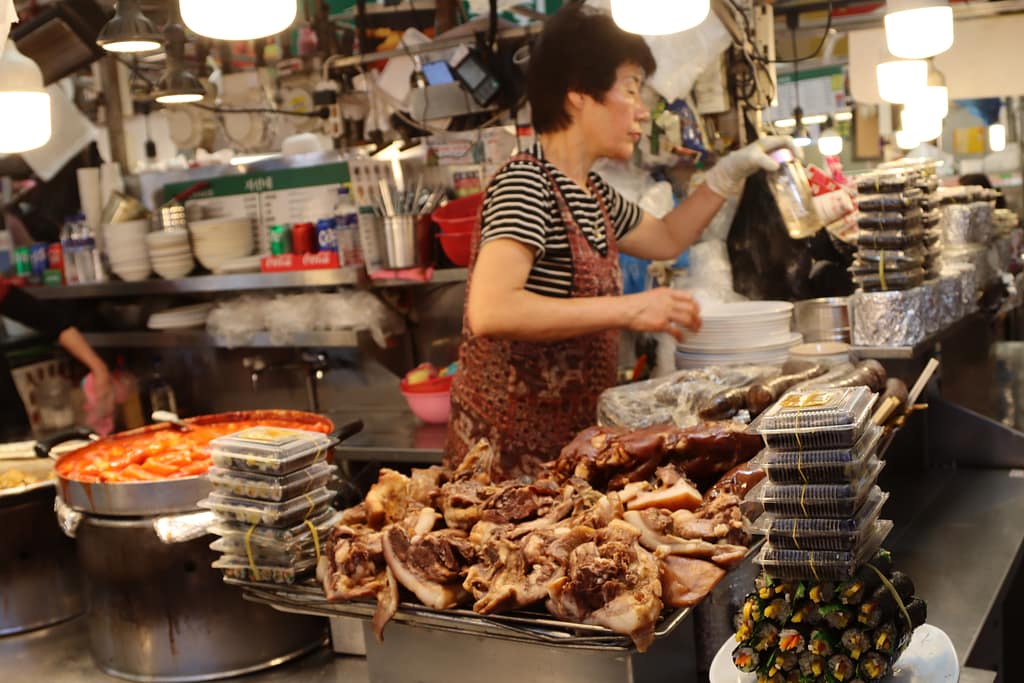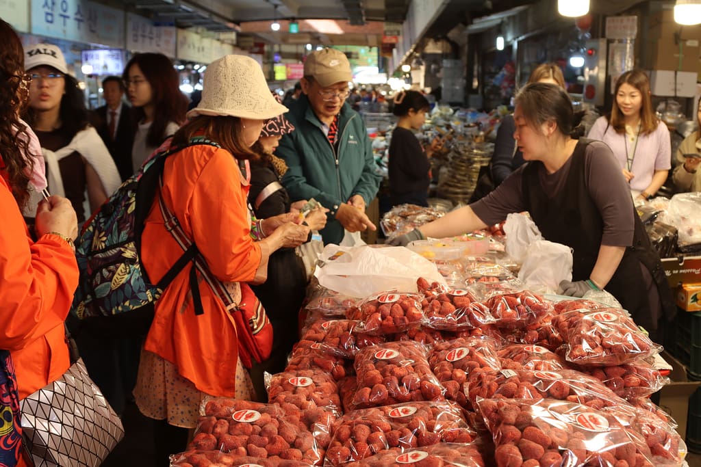 Seoul blijkt niet alleen een stad van neonlichten en markten, maar ook van groen. Tijdens een pittige hike over Mt. Ansan verruilt de stad haar drukte voor uitzichten over bossen en skyline. Tussen het zweten door voelt het als een verademing – letterlijk én figuurlijk. Een originele lunch scoren we op de Tongin Market: ouderwetse munten in je hand en dan je eigen lunchbox samenstellen uit tientallen kraampjes. Zoveel keus, zoveel smaken… Mijn lunch voelt als een mini-proeverij van Korea op zich. We dwalen door ambachtsstraatjes, shoppen lokale verzorgingsproducten (té veel keus voor de shoppende collega’s) en eindigen de dag met een Koreaanse klassieker: samgyeopsal. Zelf vlees grillen aan tafel, met sla en sausjes – wat een gezellig en interactief diner.