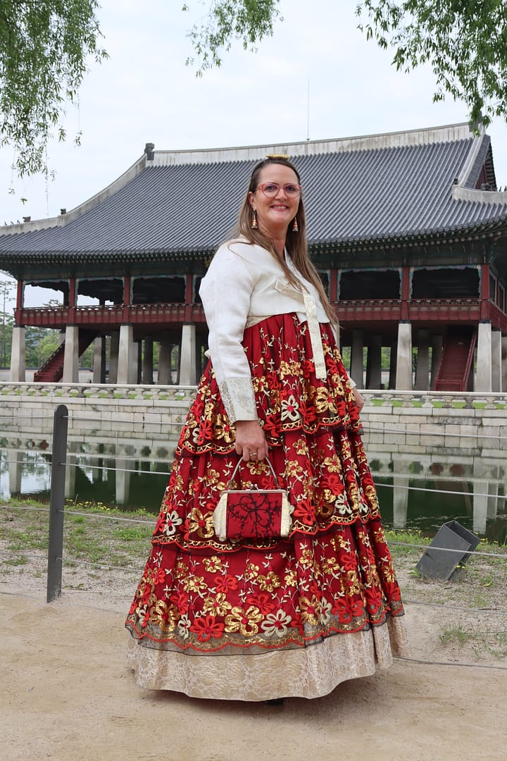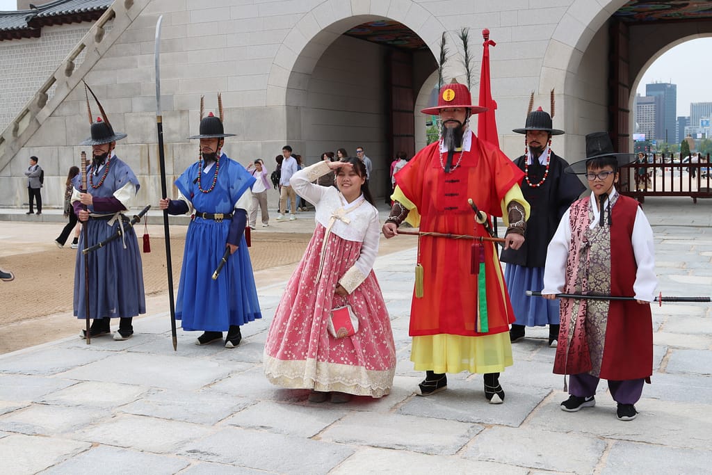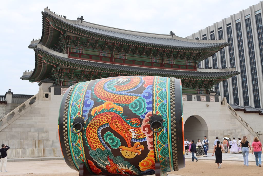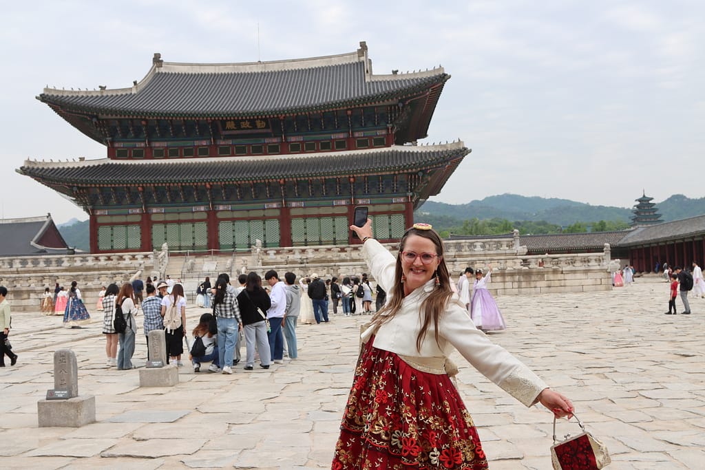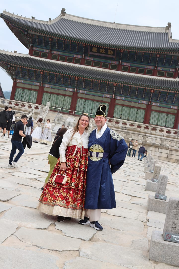 We beginnen onze reis in de bruisende metropool Seoul. Wat een energie! Alsof de stad zelf nooit stil staat – en eerlijk gezegd, wij ook niet. We verkleden ons, net als veel locals en toeristen, in hanbok, traditionele Koreaanse klederdracht, om het indrukwekkende Gyeongbokgung-paleis te bezoeken. Op tijd voor de wisseling van de wacht staan we als een bonte groep in onze gehuurde hanboks voor het paleis. De sfeer is een mix van geschiedenis, trots en een tikkeltje theater. Daarna dwalen we over pleinen, bezoeken we het presidentiële paleis, scoren we noedels uit de supermarkt (waar je ze met een QR-code in een automaat opwarmt!) en schuiven we aan voor streetfood op markten vol geuren en geroezemoes. Ik skip de levende octopus, maar geniet van zoete Koreaanse wafels met warme stroop en een theetje in een traditioneel theehuisje. ’s Avonds zitten we bij een show vol acrobatiek en lachen we ons suf bij karaoke in een privé-kamer, mét bier en twee microfoons – wat een feestcultuur!