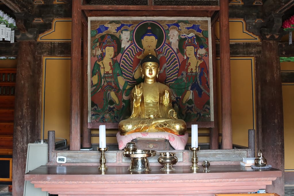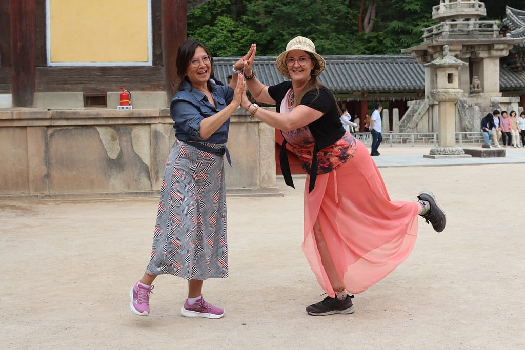 Maar het hoogtepunt van Andong is toch wel onze templestay in Bongjeongsa. Zodra we onze grijze tempelkleding aantrekken, voel je dat de sfeer anders wordt. Hier regeert de stilte, de eenvoud en de natuur. We eten sober, slapen op de grond (iets minder zen, want draaien, puffen en om 4.00 uur op), maar nemen deel aan ochtendceremonies en theemomenten met een monnik. Wat een bijzondere ervaring. Geen wifi, geen rumoer – alleen de bergen, rituelen en het tikken van een houten bel.