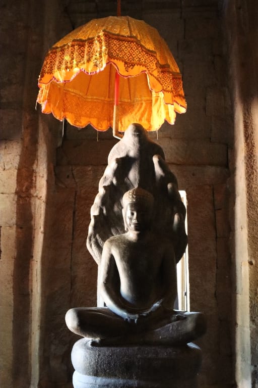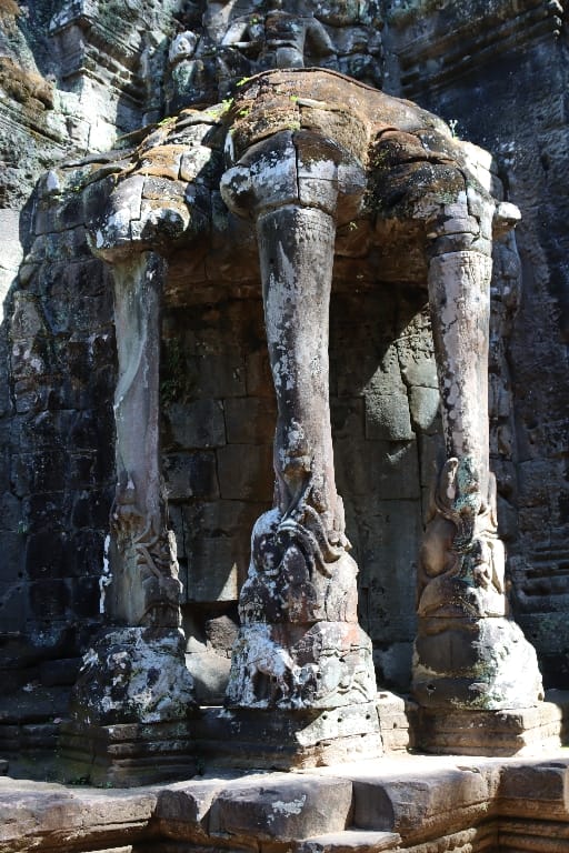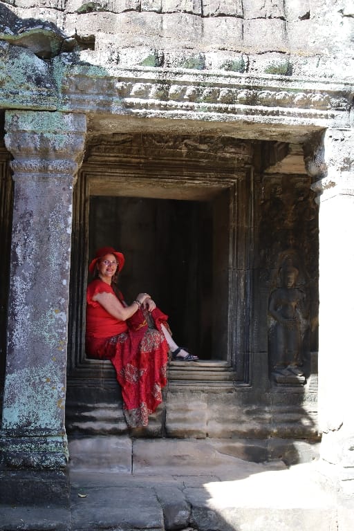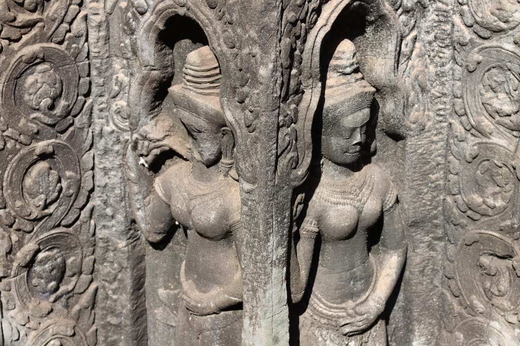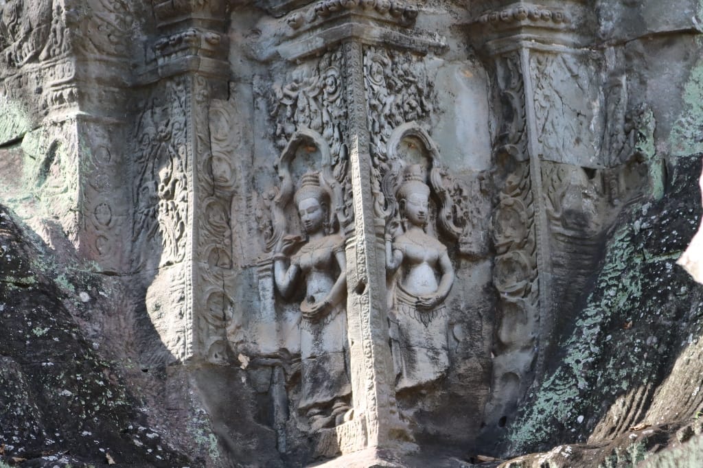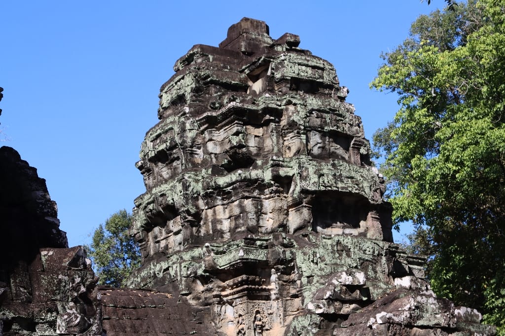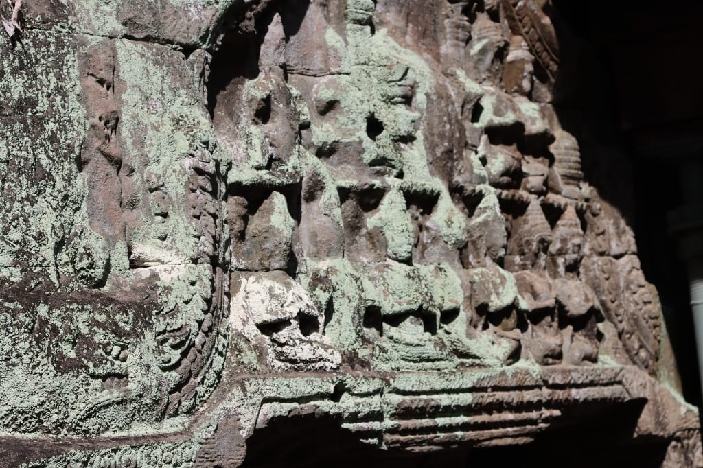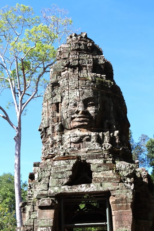 08.00 De dag begint met een bezoek aan de bekende Ta Prohm, in tegenstelling tot de meeste andere Angkor-tempels, is deze gelaten zoals toen hij werd herontdekt. Mijn fotocamera maakt overuren; hij is heel sfeervol & heel apart met de bomen die uit tempelruïnes groeien, daardoor is het een van de populairste tempels van Angkor. We bezoeken nog een aantal Angkoreaanse tempels, verscholen “in het bos”. De Bayon-tempel precies in het centrum.