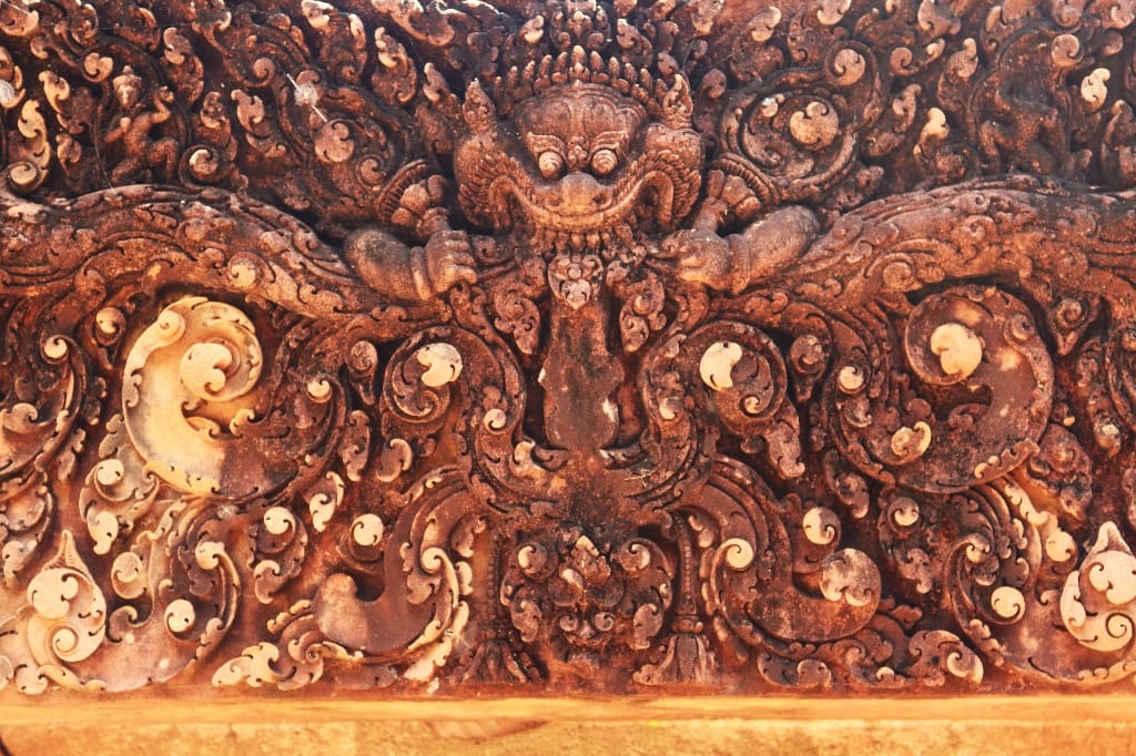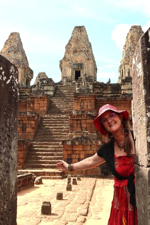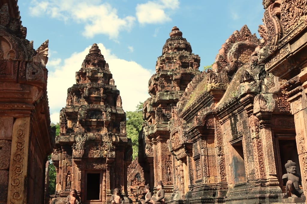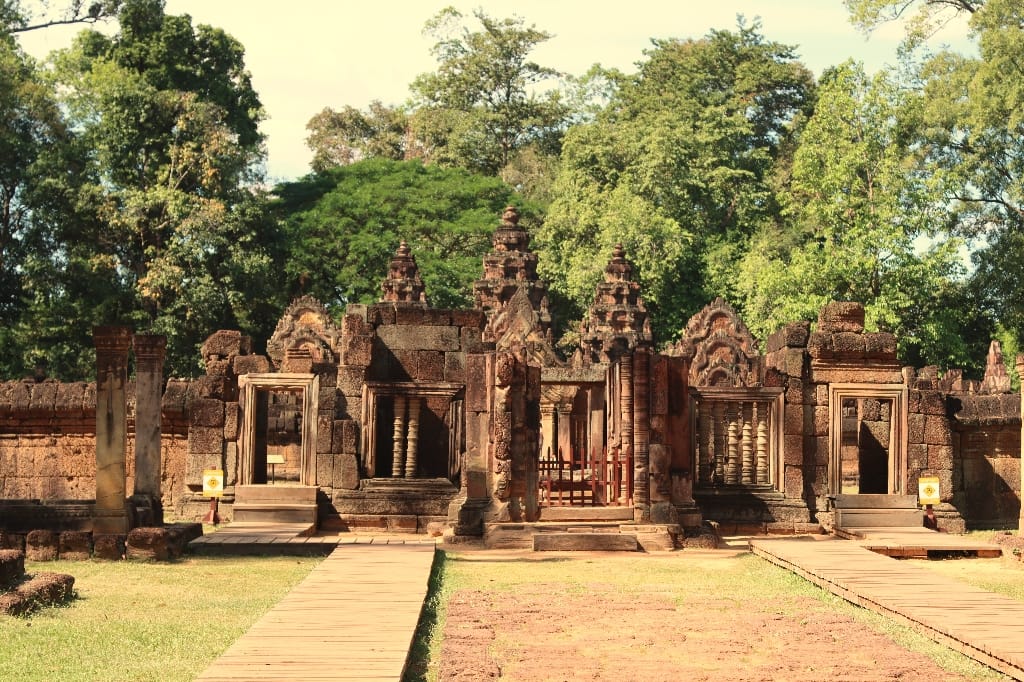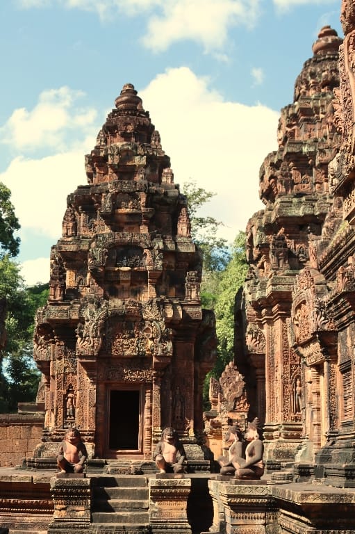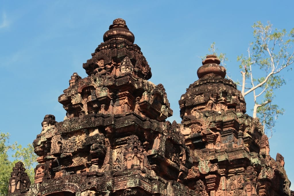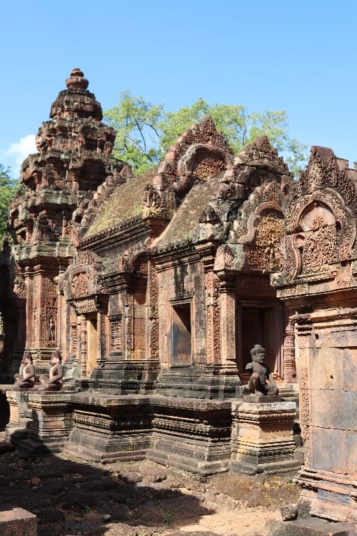 zonsopgang boven Angkor Wat. Daarna hotel om te ontbijten. Vervolgens gaan we naar de Banteay Srei-tempel: bekend als de “Citadel van de Vrouwen” en als de mooiste en best bewaarde van alle Angkor-tempels. We bezoeken nog een localmarkt, die vooral bekend staat om “de vlinder-kippen” en opengesneden hele varkens aan met spit. In de avond hebben we diner met Apsara-dansshow.